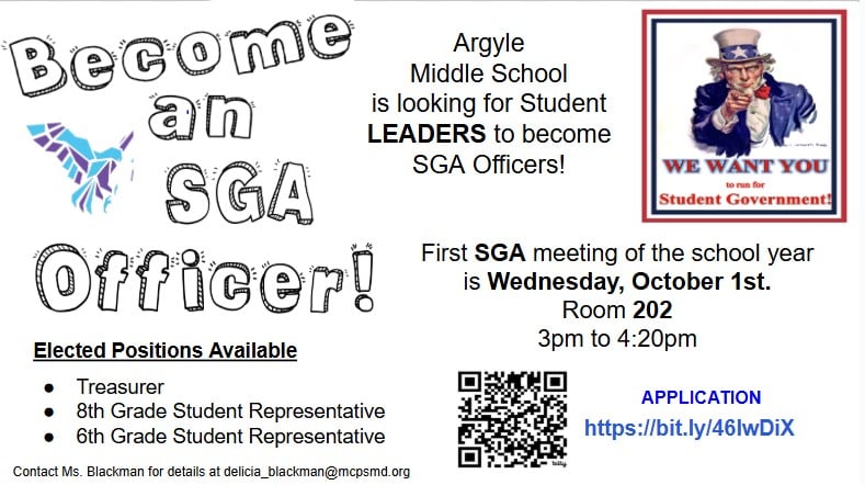 The Student Government Association (SGA) is excited to announce our first meeting for the school year happening on Wednesday, October 1st. We are looking for students from ALL grade levels who are passionate, motivated, and have ideas for improving Argyle culture and represent your fellow students to make a difference. Also applications are now being accepted for the open Officers positions of Treasurer, 8th Grade Student Representative, and 6th Grade Student Representative and are due by October 8th. Please see Ms. Blackman in room 202 for more information.
