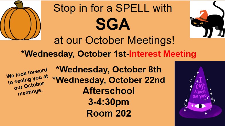 The SGA invites all students to attend our October meetings on the 1st, 8th, and 22nd of after school. Come out and begin your journey in leadership helping SGA plan events and activities for this coming school year.