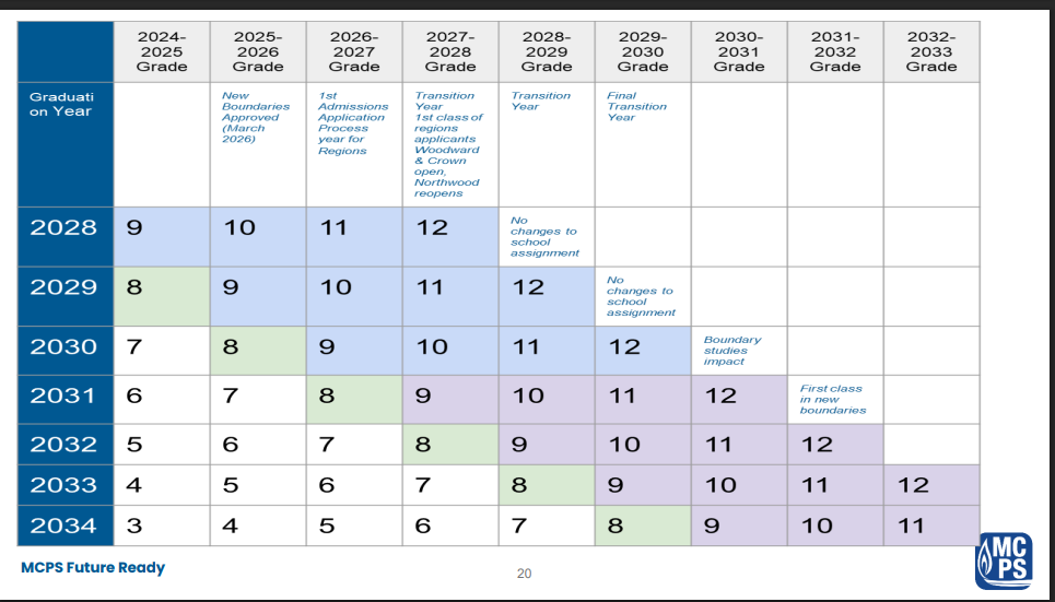 Below is a timeline visual of what this looks like for students as the proposed new six region process phases in (purple) and the current one (blue) phases out (pending BOE approval). This slide can be found in the presentation slides from the BOE meeting. 8th grade families can reach out to their counselor (Rachel_M_Greene@mcpsmd.org [A-L] or Kristen_Ruffin@mcpsmd.org [M-Z] ) if they have additional questions.